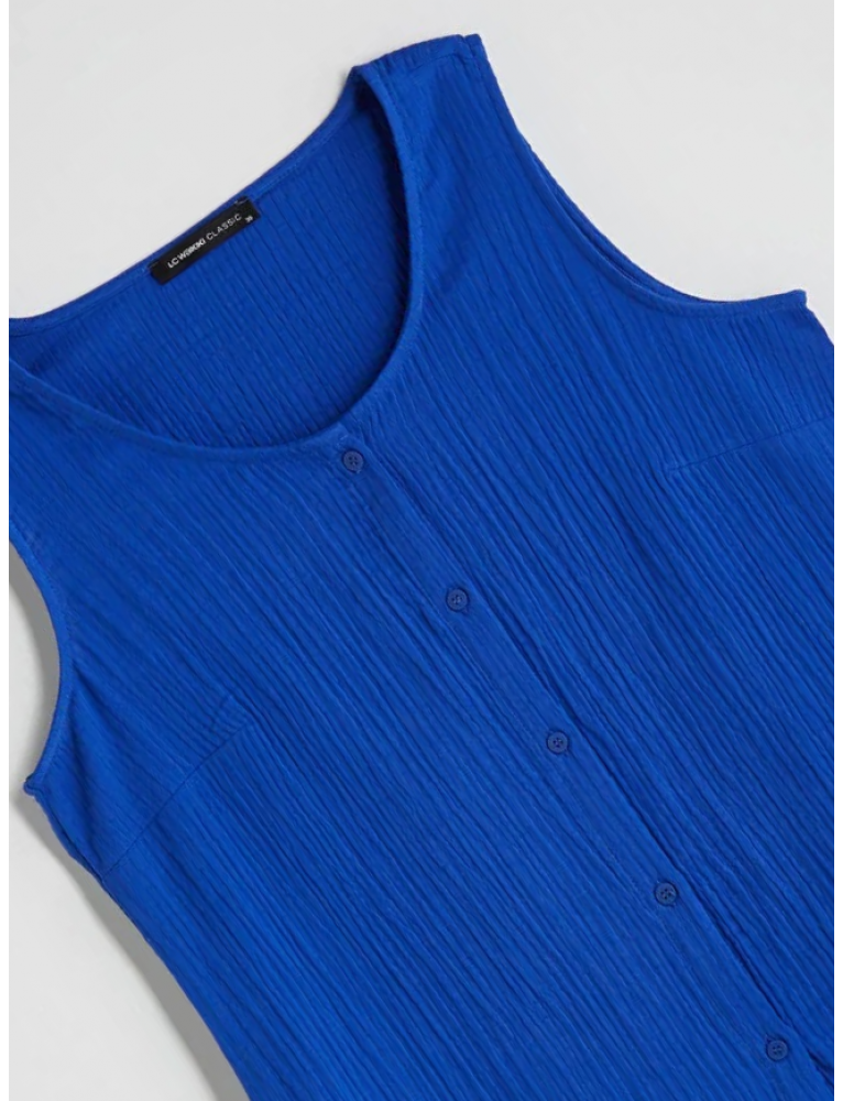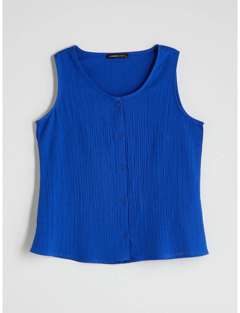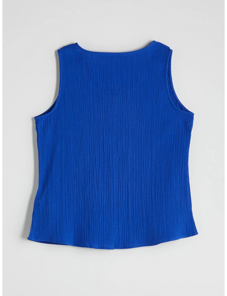 U yakalı, kolsuz bluz, dokulu. Önü düğmeli.