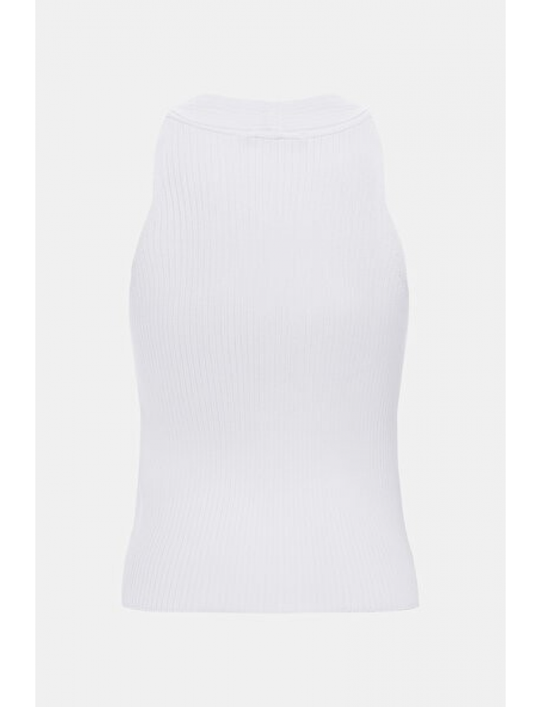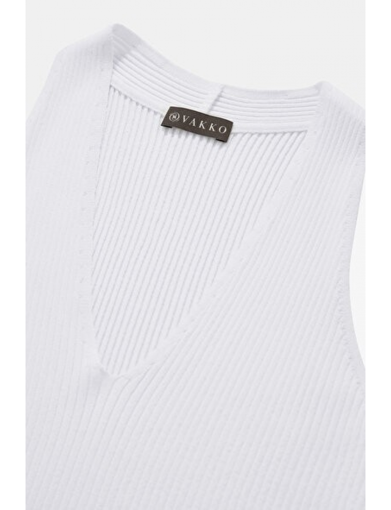 V yakalı, beyaz renkte Vakko bluz, omuz askılı şıklığıyla dikkat çekiyor.